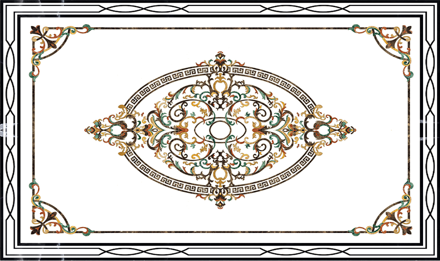 Hoa văn: Kết hợp màu vàng hoàng kim, xanh lục bảo và nâu vân đá, tạo chiều sâu và sự nổi bật.